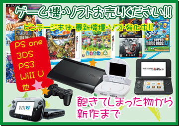 安心の無料査定です。査定額にご納得いかない場合はお持ち帰り頂いて問題ございません。 高額査定でお客様のご来店お待ちしております。 皆様のご来店、心よりお待ちしております。 ★買取例★PS・PS2・PS3・PSX・Wii・ニンテンドーDS・DSライト・PSP・Xbox360・その他ゲーム機DVDソフト PS2(プレイステーション2)/PSP/PS3/任天堂64/任天堂GC(ゲームキューブ)/任天堂wii・wiiU 任天堂DS/任天堂DSi/ゲームボーイ/セガ/マイクロソフトXbox/xbox360/ゲームソフト全般 ★動かなくても壊れていてもOK! ★品物がが入っていた箱や保証書、修理済証書、領収書等のあるものはご一緒にご持参下さい。 ★遠方の方は、電話連絡の上郵送又は宅配便にてご送付ください。 または、ご自宅まで伺うことも可能ですのでお電話にてお問い合わせくださいませ。 お近くの方はぜひご来店ください。即金にてその場で査定買取いたします。 |