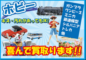 安心の無料査定です。査定額にご納得いかない場合はお持ち帰り頂いて問題ございません。 高額査定でお客様のご来店お待ちしております。 皆様のご来店、心よりお待ちしております。 ★買取例★ラジコン・プラモデル・ガンプラ・Nゲージ・鉄道模型・ディズニーグッズ・ワンピースグッズ キャラクターグッズ・トレーディングカード・ミニカー・LEGO・エアガン・フィギュア・ネオンライト・モーションランプ・その他面白グッズなど ★品物がが入っていた箱や保証書、修理済証書、領収書等のあるものはご一緒にご持参下さい。 ★遠方の方は、電話連絡の上郵送又は宅配便にてご送付ください。 または、ご自宅まで伺うことも可能ですのでお電話にてお問い合わせくださいませ。 お近くの方はぜひご来店ください。即金にてその場で査定買取いたします。 |